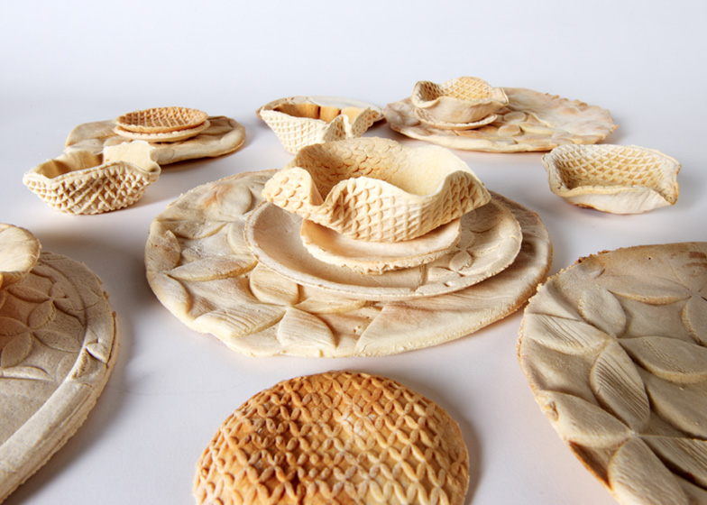 Rollware is a collection of patterned laser-cut rolling pins that can be used to create bread-based edible plates. It was designed by students from Piet Zwart Institute in Rotterdam, as a part of the Altered Appliances collection.The dough is flattened, and then imprinted with patterns. The second set of pins help to cut it into the shape of a plate. Four patterns and sizes are available, to be used with different food types. Once cooked, the plates are ready to be eaten or admired.