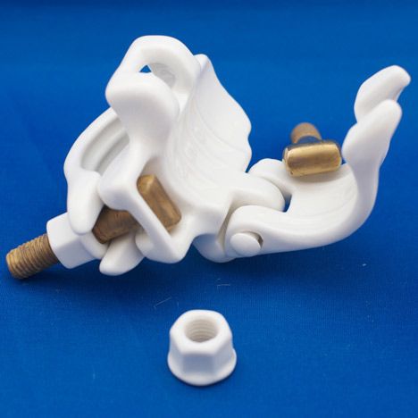 Berlin-based designers Beta-Tank think not. They've created a series of scaffolding parts for an exhibition called Scaffolding Brut that aim to add a little glamour to construction. The parts are made from white porcelain and contain gold and silver nuts and bolts. As well as adding a little beauty to building sites, they also enable scaffolding to have other practical functions, such as holding bird houses and plant pots. It's all part of a bigger project about scaffolding and urban aesthetics that Beta-Tank are exploring, which will be presented in a book, also called Scaffolding Brut.