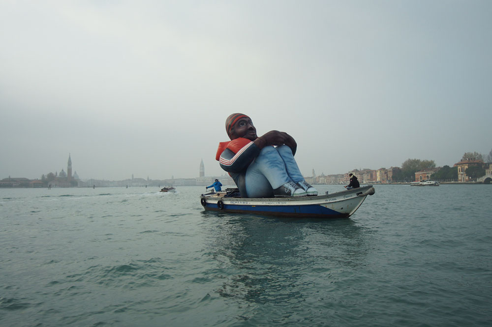 The massive adult male, clad in a life jacket and blue jeans hugging his knees in the foetal position, is constructed from the same material used to make the inflatable boats commonly used by human traffickers to cross the Mediterranean Sea.