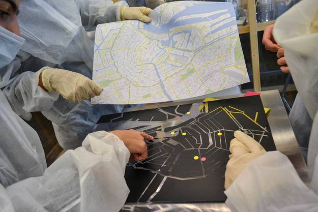 Mediamatic decided to remap the cultural pathways of Amsterdam by imitating the above experiment. They redrew Amsterdam on a scaled map of filter paper and agar, the nutrient which mold can grow in. By ensuring that the streets were agar and the building's outlined in paper the slime mold was able to navigate its environment through comparable routes that you or I would take through the city. By placing oat flakes on each of the galleries and cafes of interest the slime mold gradually mapped the most efficient way to each.