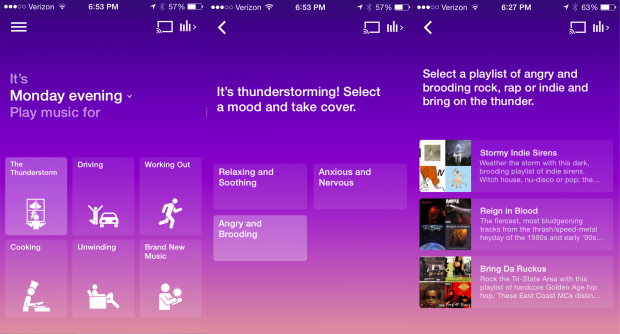 Songza teamed up with the Weather Channel to curate playlists based on real-time weather forecasts, catering for a variety of activities and moods - from “working out” and “unwinding” to the gloomy-sounding “looking at pictures of your ex”. Now these will align with the weather, even taking subtle queues from temperature and precipitation to understand the sort of sounds the listener prefers to hear according to subconscious reactions to the environment.