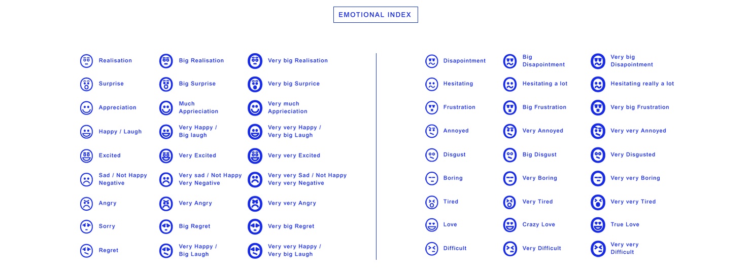 The Sound-Word index was created by two RCA graduates, Blanche de Lasa and Stina Gromark, and aims to help translate the emotions hidden behind our screens. As they explain, 'without the help of body language, words can often fall short in our digital conversations'. The use of sound, volume, and rhythm therefore are the three tools by which emotions can be translated over the internet with their site explaining how to navigate this vocabulary.