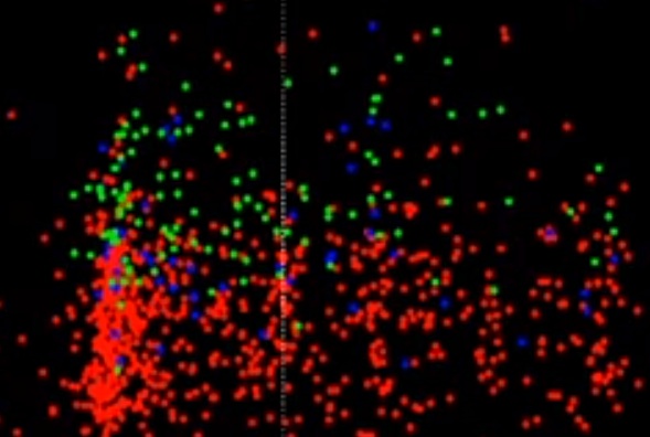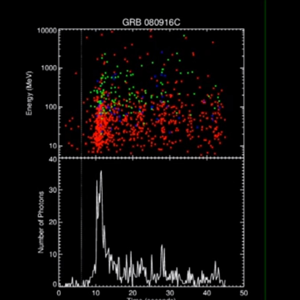 Gamma ray bursts are some of the most powerful explosions in the universe. A particularly explosive number back in 2008, the GRB 080916C, was captured by the LAT and is the basis for the musical track. During the brightest part of the explosion, the LAT detected 100s of gamma rays from the extremely-distant explosion. NASA converted the data to music and slowed the rates down by a factor of 5x to hear the individual gamma rays better. Each was then represented by a different instrument (harp, piano etc) and along with the accompanying animation, illustrate the explosions journey.