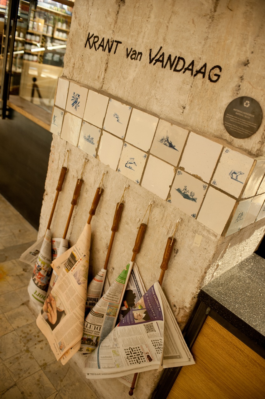 Designed by Dutch-born Starbucks concept design director, Liz Muller, the space spans over 430 sq m and uses reclaimed materials such as wood within its design. Walls are lined with antique Delft tiles, bicycle inner tubes, and wooden gingerbread molds. In addition to the unique interior design, the store will serve as a testing ground for new and innovative brewing methods, while serving fresh food from the in-store bakery.