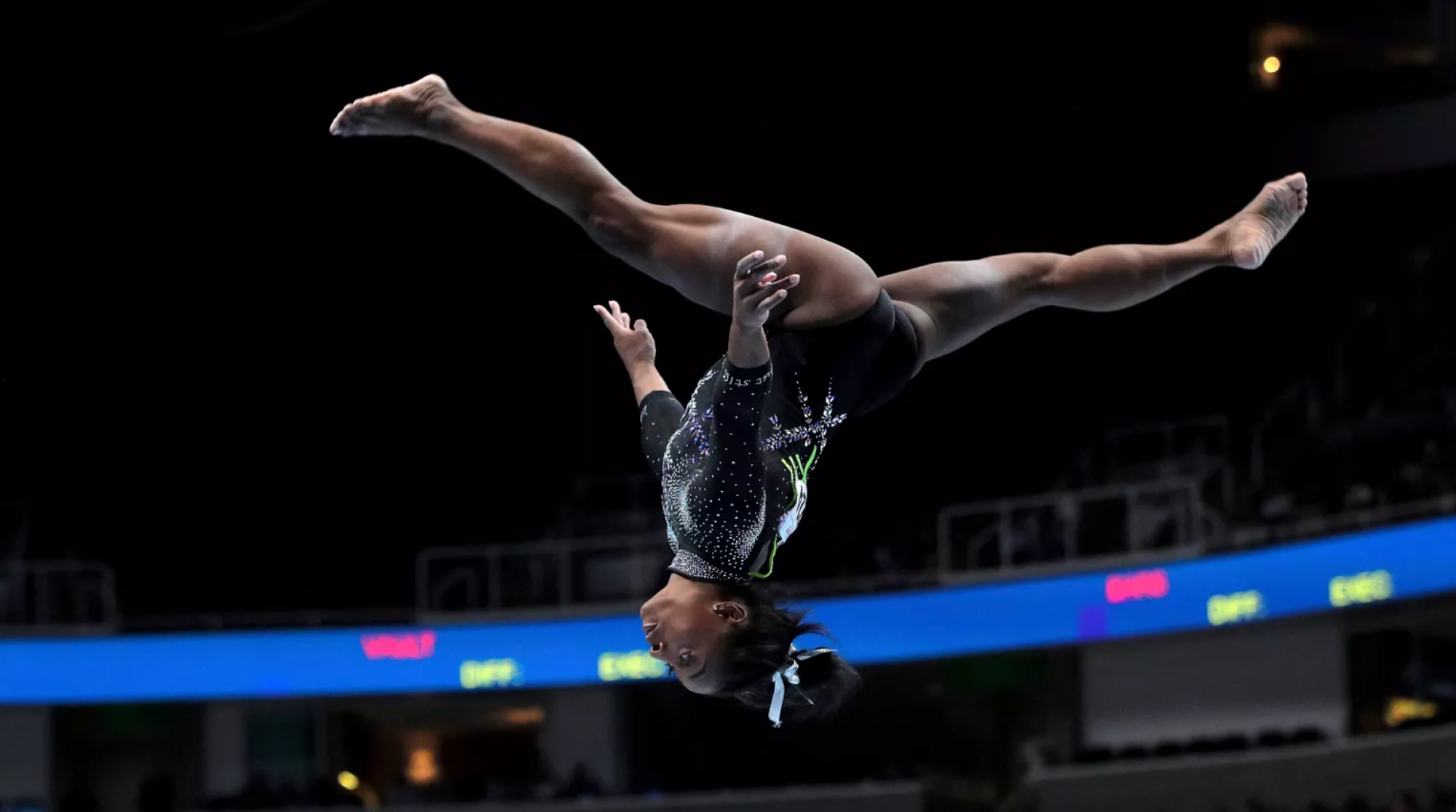 Simone Biles by Gregory Bull/Associated Press in 2023. In mid-air, the body folds into pure geometry. This is the paradox at Stillness Mode’s core: motion can fold into pause, and through waiting for and witnessing that moment the sublime is made visible.