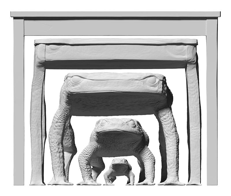 Oliver Laric, Metamorphoses, 2024. This digital sculpture dissolves taxonomy. Stillness here is deceptive: beneath the static frame lies endless becoming. The image does not change but it creates echoes.