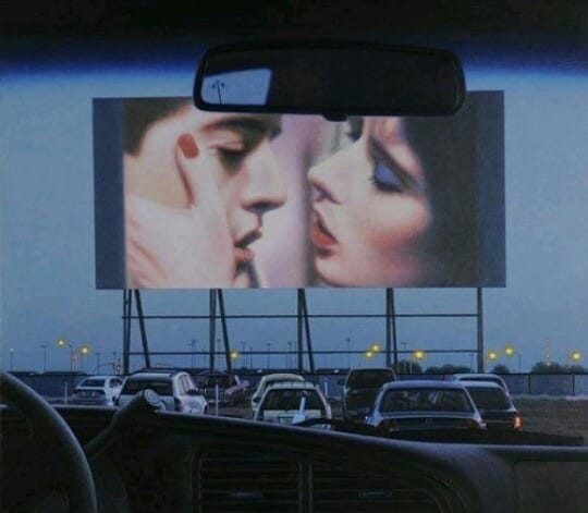 Film still, source unknown, showing desire suspended. The cars sit in quiet witness. This is stillness as shared solitude: love framed as afterimage, connection held at a distance, the communal experience of waiting for resolution that never comes.