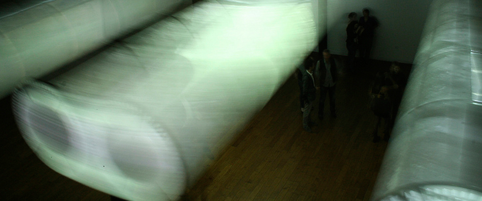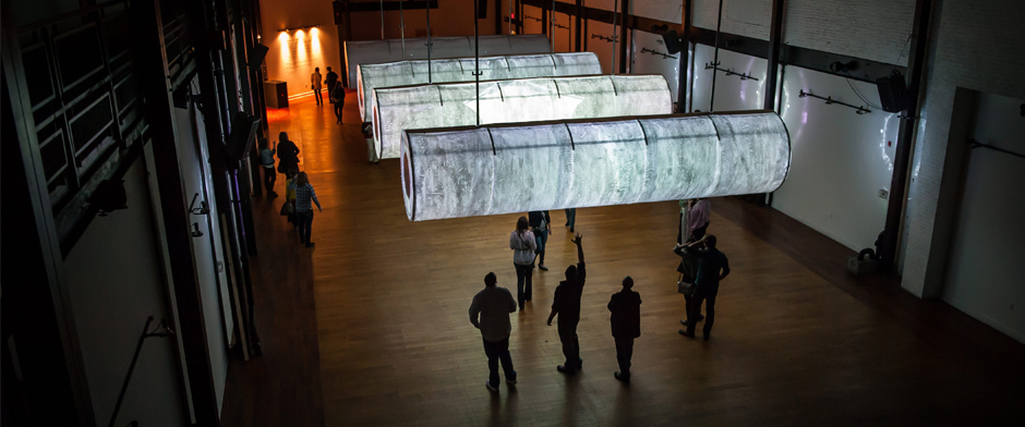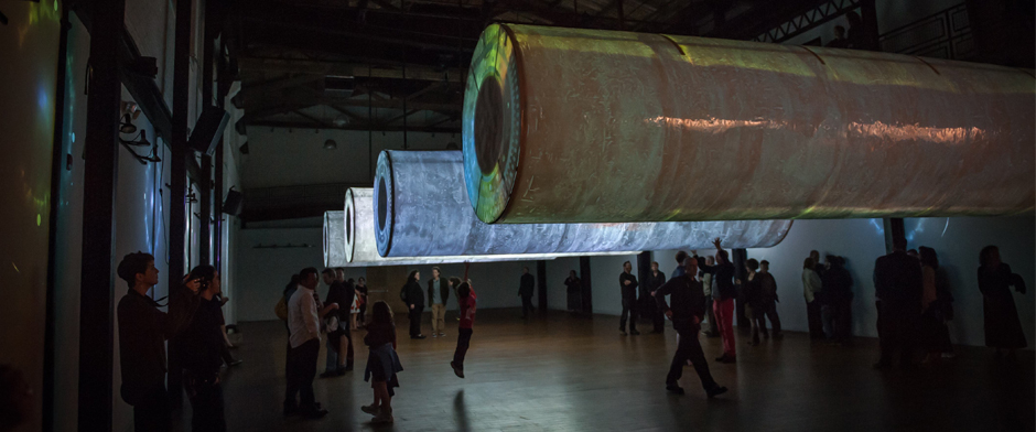 Similar to the Rain Room at the Barbican, visitors get to experience the atmosphere without actually being affected by its unpleasant side effects. The interactive sound and video installation is made up of cylindrical resin sculptures that are hanging 40 feet from the ceiling, displaying raindrops and slow moving clouds. By pushing the sculptures, noise is triggered, the movement starts to accelerate and a torrential storm breaks loose, depicting rain and electrical charges. Thevisitors decide on the intensity of the storm by acting as both conductors and musicians.