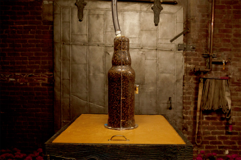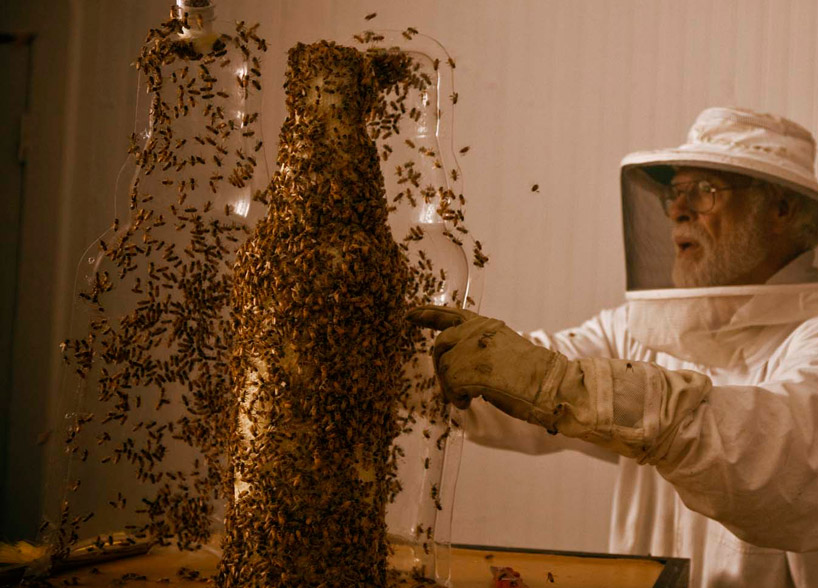 To overcome the bees' naturally inclination to build inwards, the team created an 'inside-out hive' by 3D printing a mold of outwardly facing hexagonal cells to imitate the honeycomb pattern produced by the bees in their natural environment. To further fortify their forgery, the team covered the faux-hive in real beeswax before enclosing the structure within a transparent plastic case. This afforded the team the rare opportunity to witness the bees at work in their most natural of states; indeed, the bees were fooled into producing sufficient wax to form solid sculptures, including a whisky bottle and a bust of the Dewar's Drinking Man.
