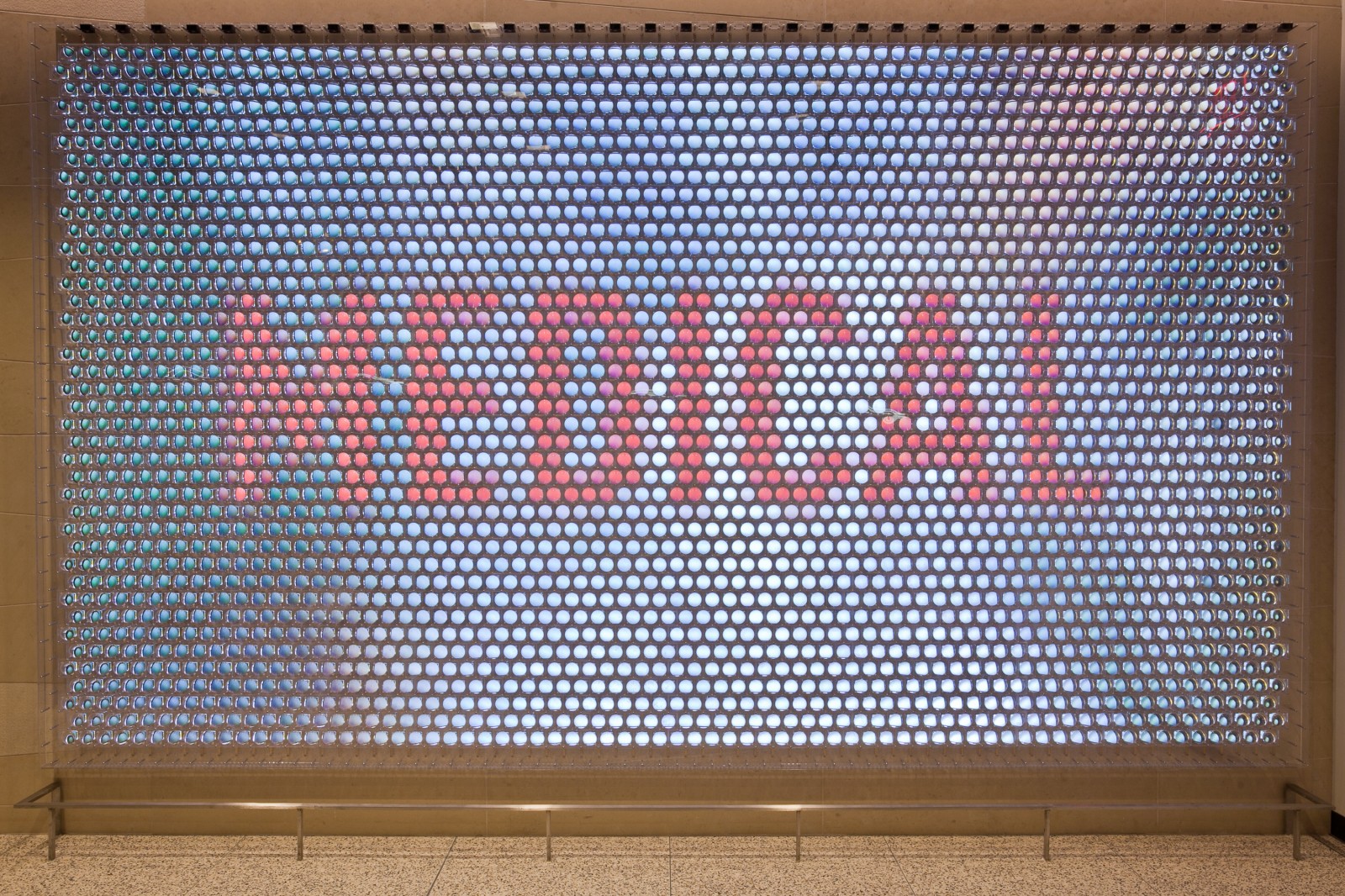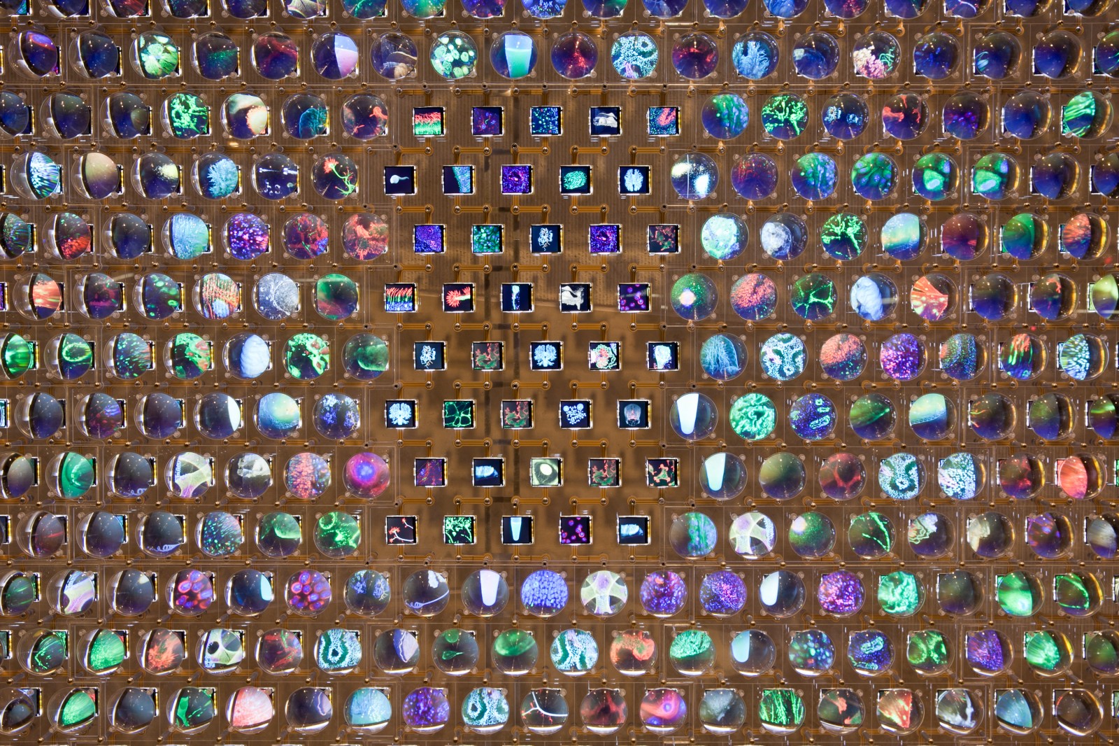 From across the street, the wall looks like a huge animated image, but as you get closer the detail becomes apparent. “The Discovery Wall offers viewers three distinct positions to engage with the artwork” say the creators. “From across the street there is a macro view – a large scale image that can be a huge resolution image or an animation; outside the window, the viewers will see the mezzo content – titles of research areas and clusters of hundreds or thousands of images; and, by standing right in front of the artwork, viewers can discover the final, micro view – high resolution images and paragraphs of text related to the area of research visible from the mezzo and macro positions.”