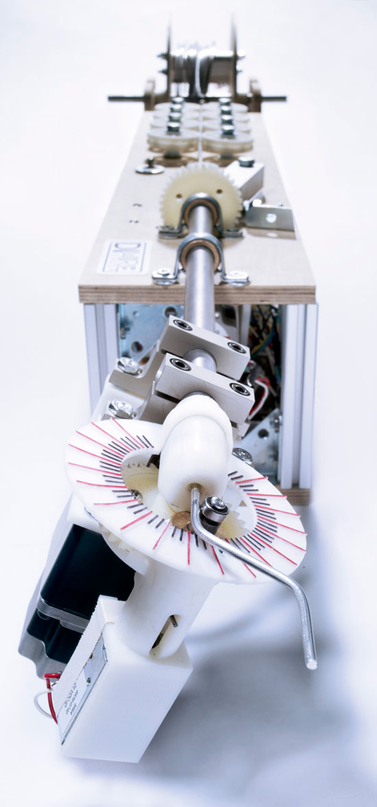 The DIWire Bender is a rapid prototype machine that bends metal wire to produce 2D or 3D shapes. Wire unwinds from a spool, passes through a series of wheels that straighten it, and then feeds through the bending head, which moves around in 3 dimensions to create the desired bends and curves. It’s essentially a 3D printer that describes lines, instead of volumes, in space.