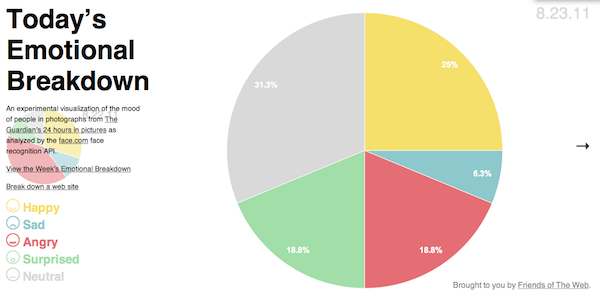 The Emotional Breakdown is a new web tool that measures levels of happiness. The website was created by participants of New York’s Photo Hack Day who were trying to create something unique and interesting using API tools such as the facial recognition application Face.com. The Emotional Breakdown analyses the emotional state of the world by detecting the facial expressions of people in photos. It graphs the mood of inputted webpages with simple pie charts visuals. By default the website shows the mood of The Guardian’s 24 Hours In Pictures feed, but users can also break down the emotions of other websites. When the chosen URL is put into the website, the software compiles the data into happy, sad, angry, surprised and neutral. It’s interesting to see how software like this can be used as a relevant and current analysis tool, and how digital technology can be used to quantify human expressions.