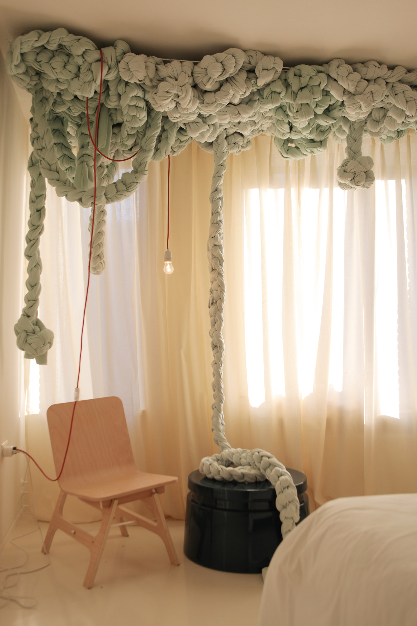 With themes such as the 'eighties' and 'epaulettes', the interiors are animated by textures and compositions that push the boundaries. For the 'crinoline room', designer Sofie Sleumer created a larger-than-life bustle cage around a bed to emphasise the concept of 'dressing' the hotel. Following on from this idea, guests can also dress themselves or their own homes as the hotel has an on-site boutique. Curated by the design studio OPTIONS, the shop offers a selection of exclusive products that co-incide with the themes of the pieces presented by the AMFI students.