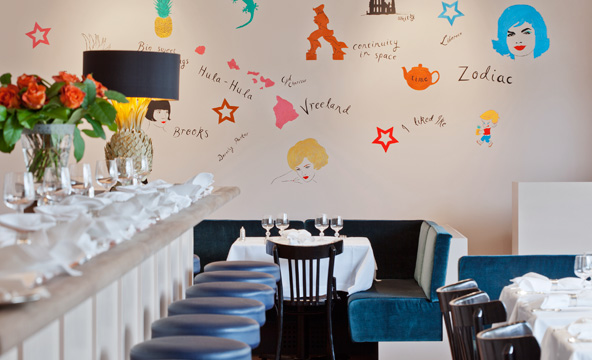While The Filling Station is by no means a pop-up, it is nevertheless a transient venue with plans to only remain open for the next few years. The architecture and design of the space is inspired by this fact, with a cinematic Ed Ruscha inspired roof signage and illuminated fiberglass walls which can be recycled once the project ends. By contrast to the stark architecture, the restaurant is decorated with kitsch pineapple lamps and Americana - inspired wall doodles from artists Donald Urquart and Jonathan Trayte.