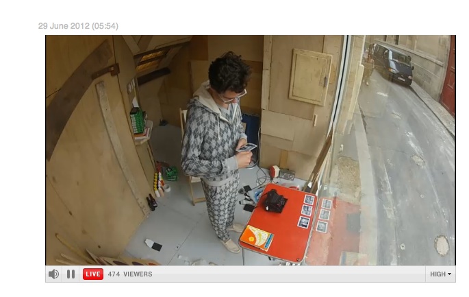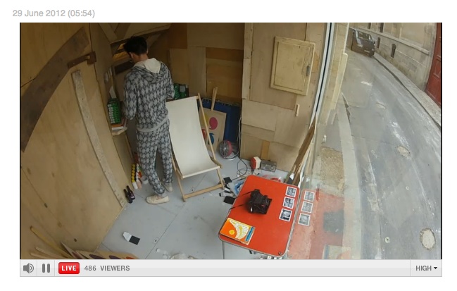 Their presentation consists of a single male model sitting in a folding chair in, "a small compartment built from cardboard boxes and wood planks adjacent to the window of an anonymous gallery in Paris." The model changes outfits once every 90 minutes, with the show lasting for a mind-blowing 60 hours. Each outfit is photographed and uploaded to the website, where a live stream of the show can also be seen. Guests wanting to see the show in person can request an appointment, or try to find the location on their own and peer through the window.