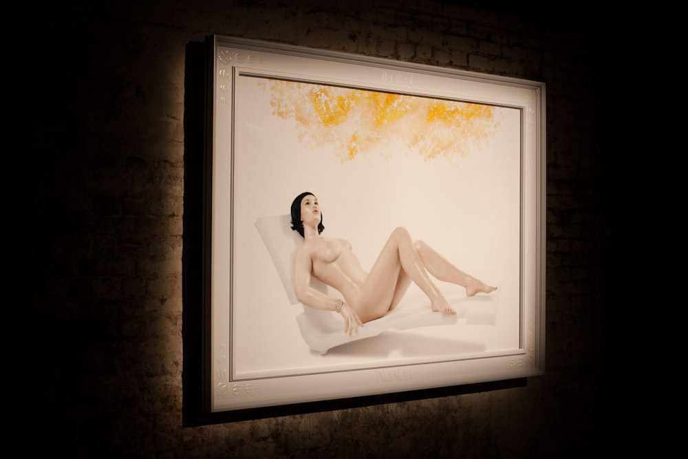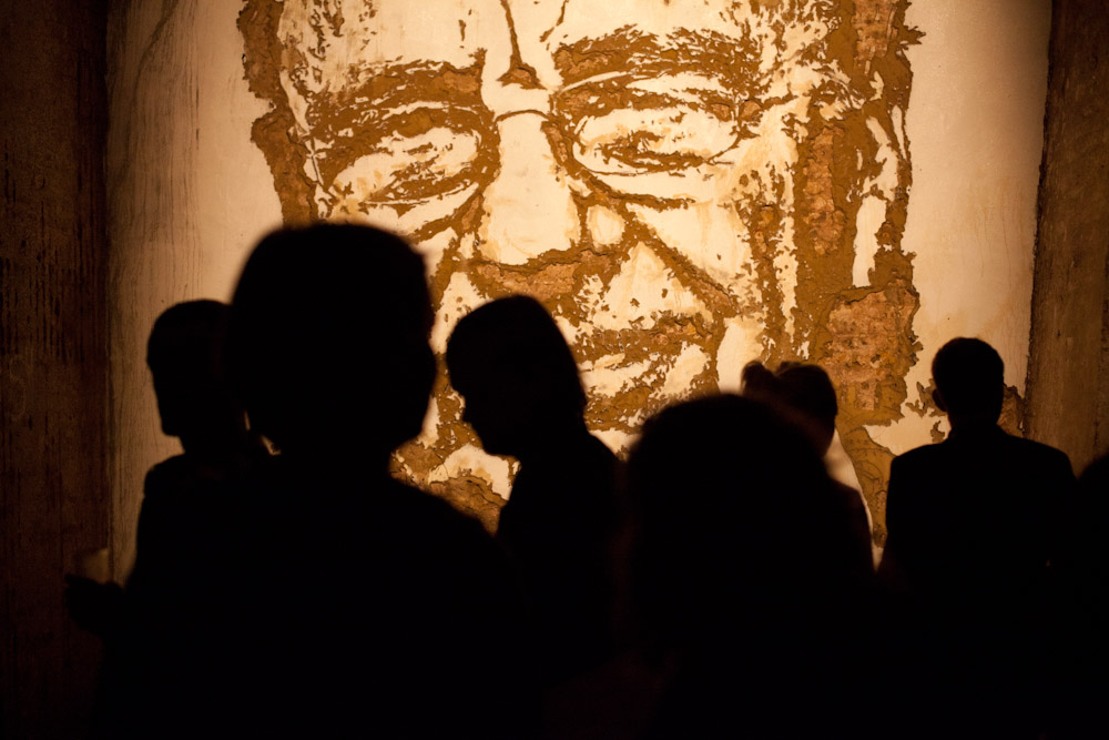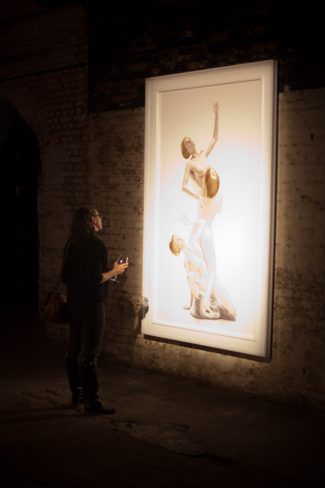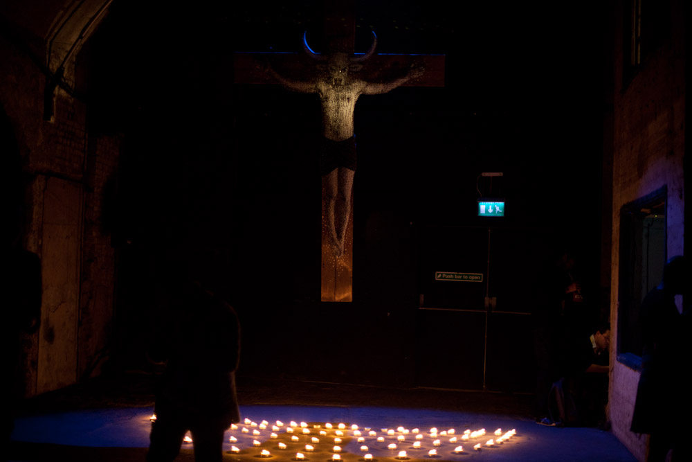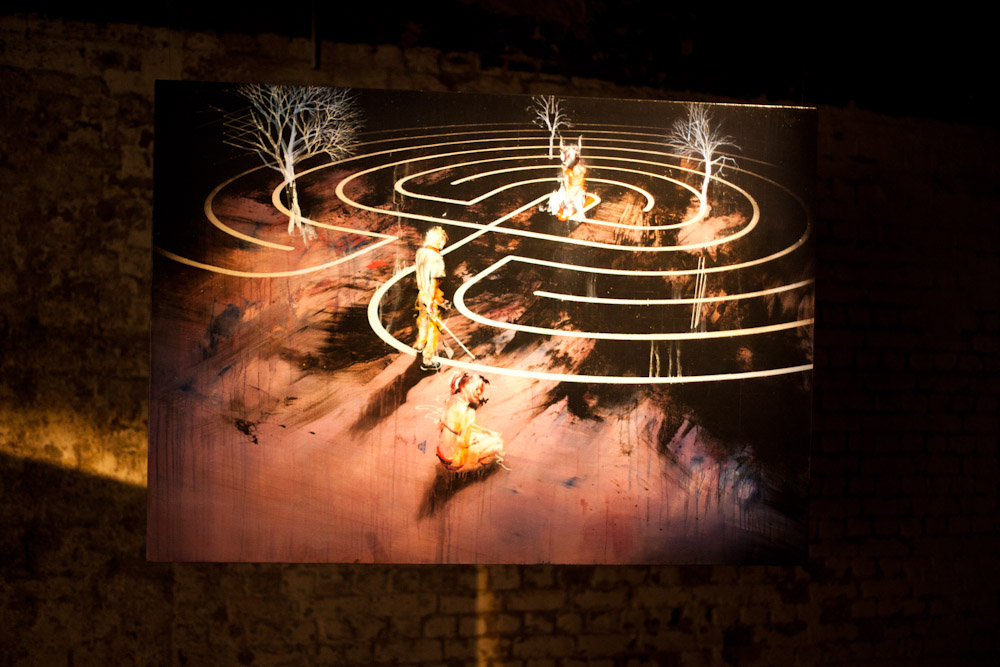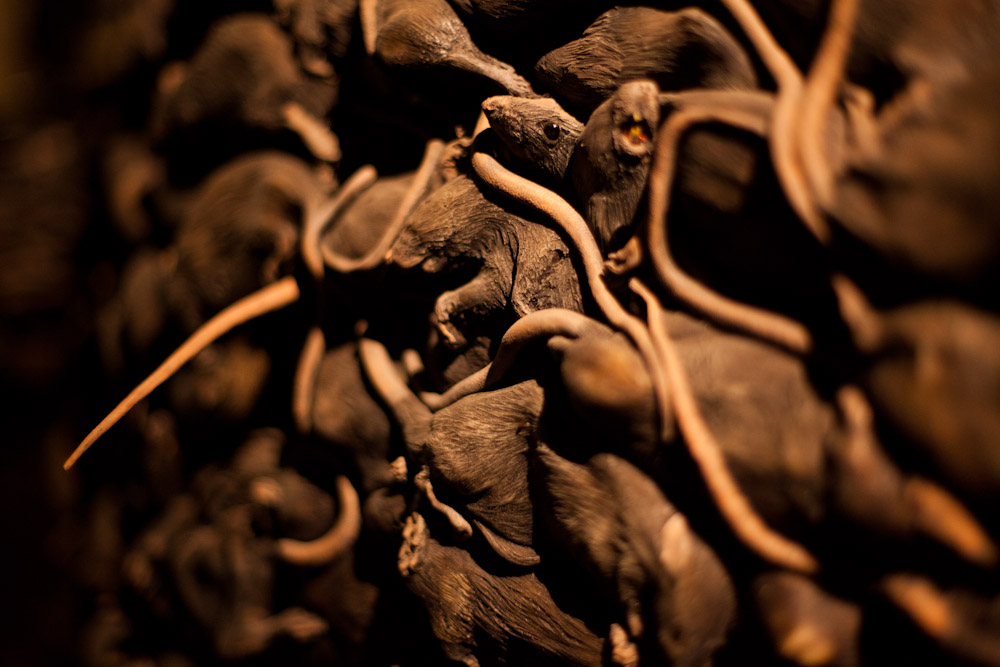 Guests were invited to wonder around the eerie space and look at a selection of installations and canvas works that had been curated by Lazaridis and responded to the theme of The Minotaur. One artwork was a small labrynth, created by Radiohead's front man Thom Yorke, which let visitors make their way through a winding corridor of mirrors and strobe lights. Another was much more macabre: a sculptured monolith created from small models of rats.