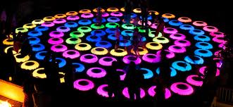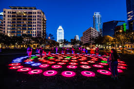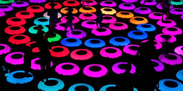 She put together 106 circular platforms that are able to communicate wirelessly, with each pad changing colour based on user feedback. As a person places pressure with their foot on the pad’s surface, light ripples, of varying intensity, are sent in that direction. A stronger lean can cause a ripple to jump rings, and even fill an entire pool. All together they create complex colour arrays. The more people participate, the more ripples are created.