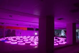 Wirelessly connected circular platforms respond to a person's movements and send ripples of light through the installation.