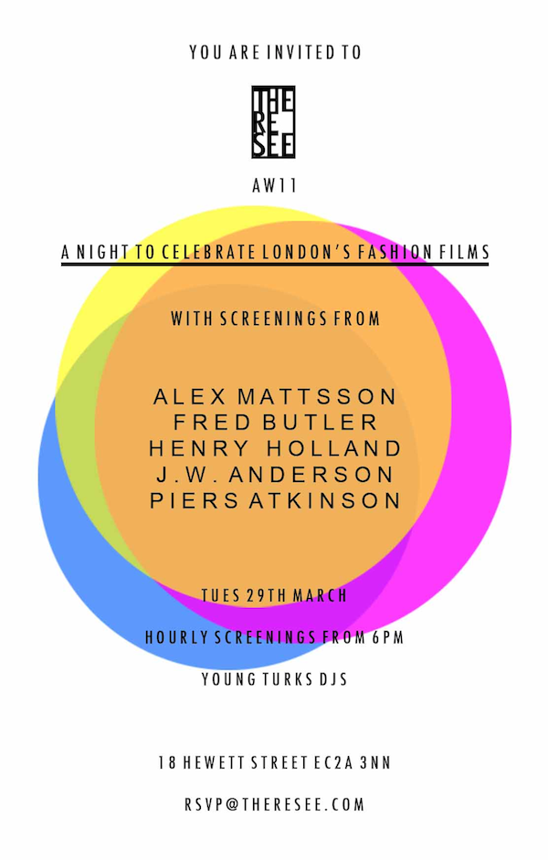 If you’re a fan of fashion and film (who isn’t?) come down to 18 Hewett Street next Tuesday night for The Resee AW11 film screenings from designers Alex Mattson, Fred Butler, Henry Holland, J.W. Anderson and Piers Atkinson. It’ll be a night celebrating designers turning to film to showcase their creative vision, hitting up another platform other than the internet and bringing it all together in a final collaboration. It’s a party so of course there’ll be a bar and the always fun Young Turks will be on DJ duty. Please RSVP to . See you Tuesday. p.s. Have a look at what went down at the The Resee back in October here.