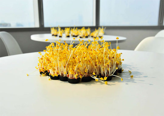 Radishes grown in soda lids can be easily moved around the office; a drawer can become a small scale incubator, a desk transforms into a temporary farm and plants commandeering the space for their own ‘green purpose’, hijacking the intended functionality of objects and spaces.