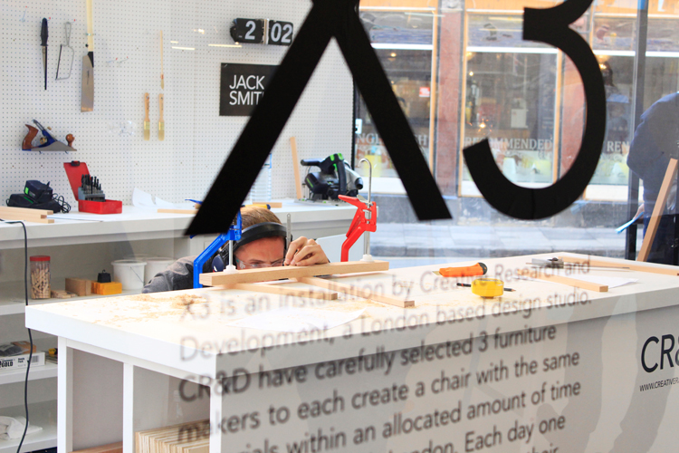 The first day started with recent RCA grad Sam Weller, followed by Alex Hellum, and finishing with Jack Smith. Inside their perspex workshop each maker created a truly original piece – highlighting the difference in their individual styles and techniques. The project is a nice exercise in exploring creative process and inspiration, and how different designers may approach the same problem. The finished chairs are now being auctioned off for charity, so get involved here, and check out the images from the installation below, and the film above.