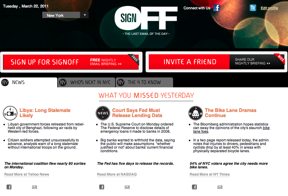 New Yorkers, let us introduce you to your last email of the day, via SignOff an end-of-day email that swiftly summarises everything that took place over the previous 24 hours. SignOff takes the work out of catching up with the world in ‘what you missed today’ and conveniently highlight the most interesting international, national and local news from the worlds of politics, business, technology, money and entertainment. Also featured is ‘what you can’t miss tomorrow,’ an events listing and deals, and ‘in case you can’t sleep,’ recommendations of entertainment, books and local hotspots.