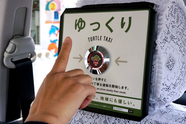 Life in the fast lane is an option more and more citizens of the Japanese city Yokohama are opting out of with the introduction of the Turtle Taxi. In the back of the car the passenger is offered the 'Yukkuri' button which, if pushed, tells the driver he can slow down, offer a smoother ride and switch off the engine at lights.