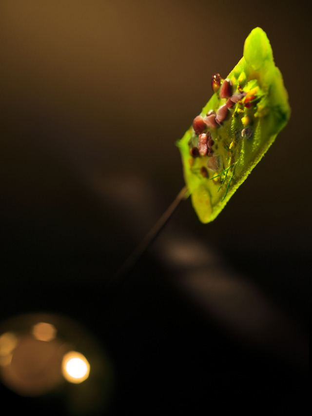 The guests receive the theatrical twenty course set menu at the same time. Each dish is accompanied by a carefully curated set of sounds, visuals and scents, all intended to create an environment that enhances the flavours of the meal. Dishes include Pairet’s version of fish and chips – a single, battered caperberry stuffed with anchovy paste – which is accompanied by a grey storm and the sounds of thunder, before a British flag lights up the table and The Beatles’ song “Ob-La-Di, Ob-La-Da” begins to play.