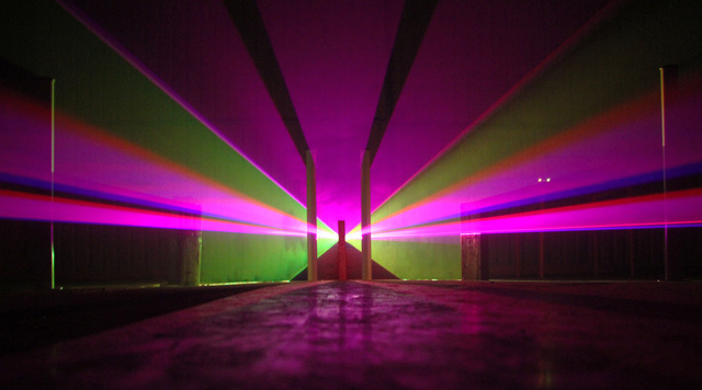 Meticulously programmed lasers produce sweeping beams of light that are obscured or appear to be obscured by various arrangements of poles and blocks. The coloured rays cast artificial shadows as they hit temporary obstacles, tricking the eye into perceiving compositions of objects that do not exist. This produces an otherworldly effect, where the physical appears and disappears in a split second, mapped by a backdrop of bright, vibrant colours. Viewers must attempt to decipher which objects are real and which are creations when exploring this blend of illusion and reality.