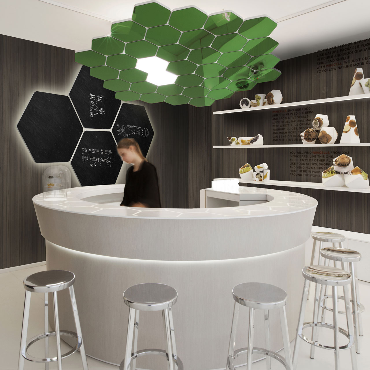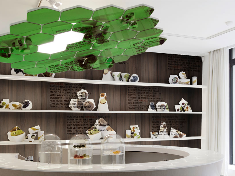 The hexagonal pattern used by Lehanneur in both the mirrored ceiling light and under-lit counter are designed to reflect and reference the molecular structure of the food, and the simple design correlates nicely with the story of WikiFoods, proudly told on the shop’s rear wall. Founded by Harvard Professor David Edwards in collaboration with designer Francois Azambourg and biologist Don Ingber, the project was initially developed as a concept to design food that can survive without protective plastic packaging, and the trio are now planning to open another WikiBar in Massachusetts, as well as a series of pop-ups.