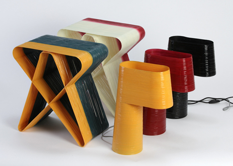 Working on the same principle as 3D printing, Industrial design graduate, Andrey Grisko's furniture is the result of several overlapping layers. A mould serves as a base around which fibreglass thread – which is first passed through a pot of coloured resin – is pulled around by a computer-controlled arm. The resin-soaked furniture is then left to dry, cure and set, before the mould is removed and the final product is ready.